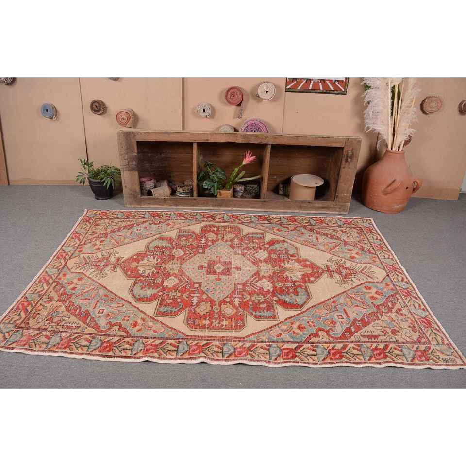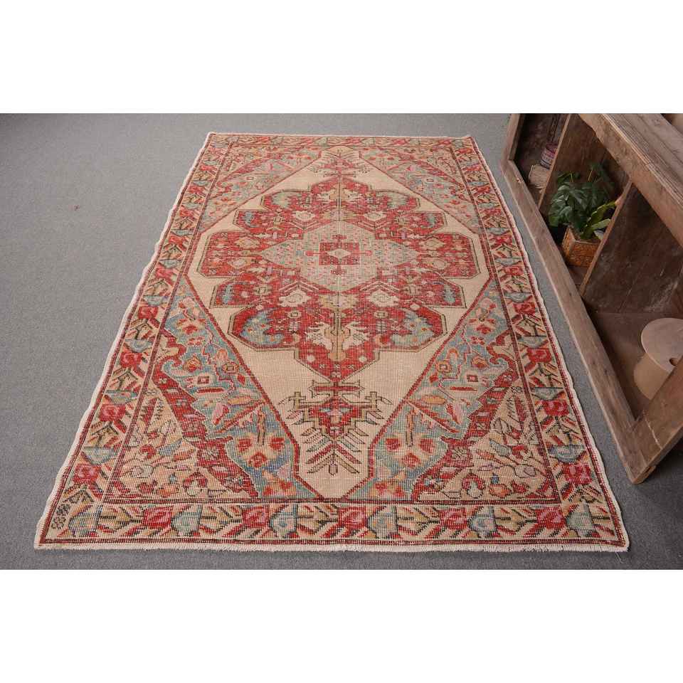Vintage Turkish Rug 5x7ft Red Beige Large Area Woolen Patchwork Design Latex Backing for Hallway Bedroom Model Room Bedside Rug