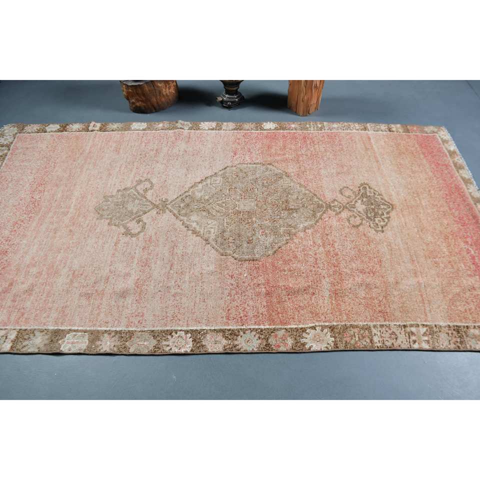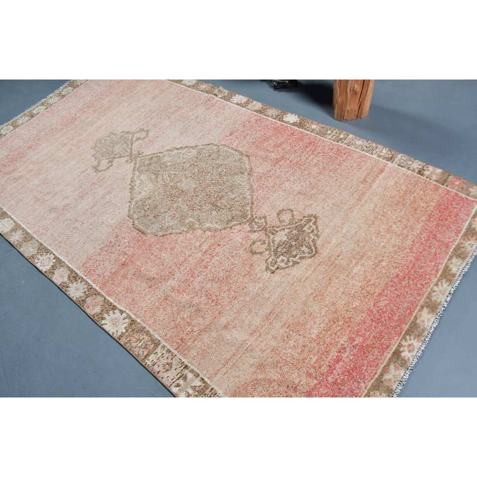 Vintage Turkish Rug 5x9ft Red Beige Large Area Woolen Patchwork Design with Latex Backing for Hallway or Bedroom New Model