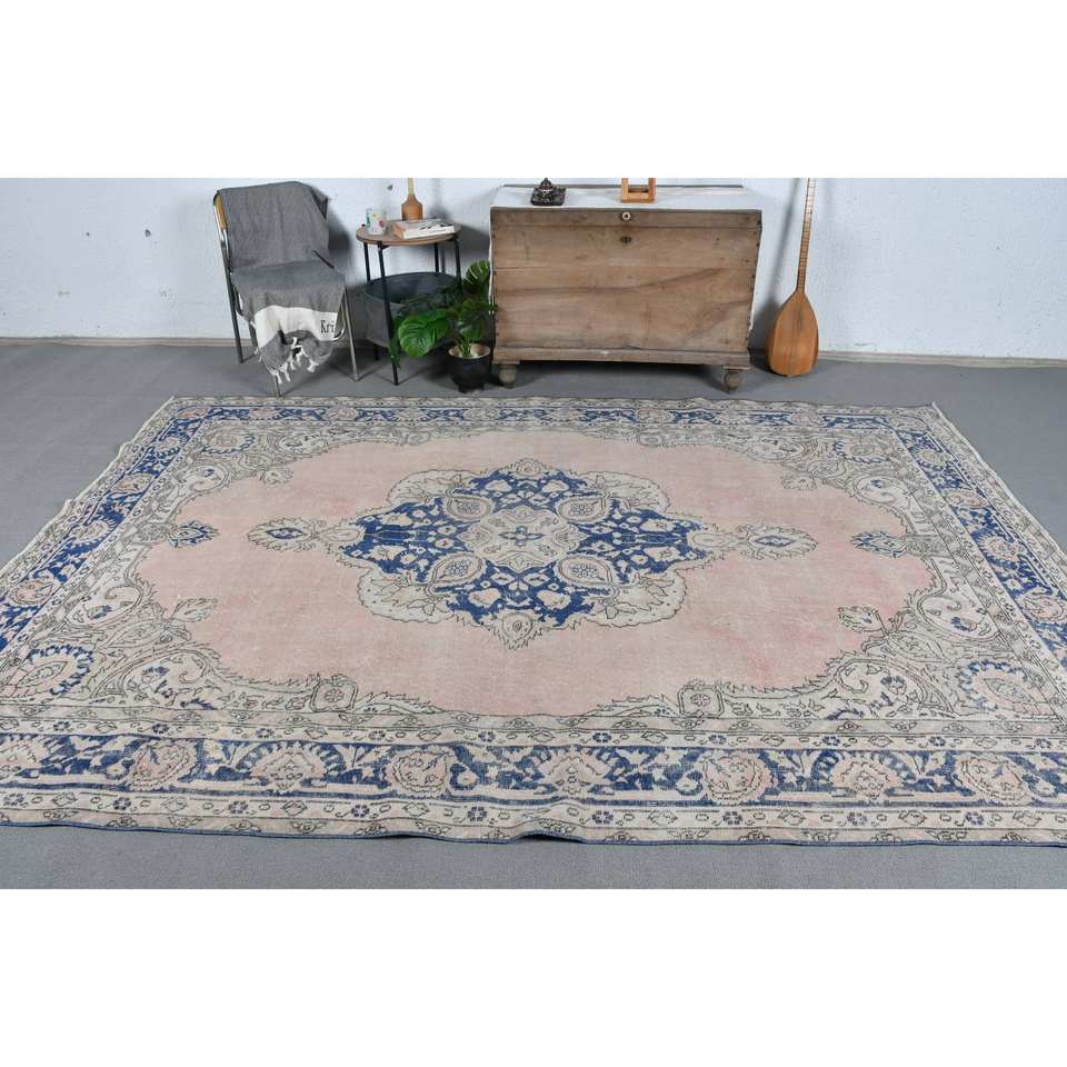 Vintage Turkish Rug 6.9 X 10.2ft Pink Blue Patchwork Design Flat Weave Wool with Latex Backing for Living Room Decorations