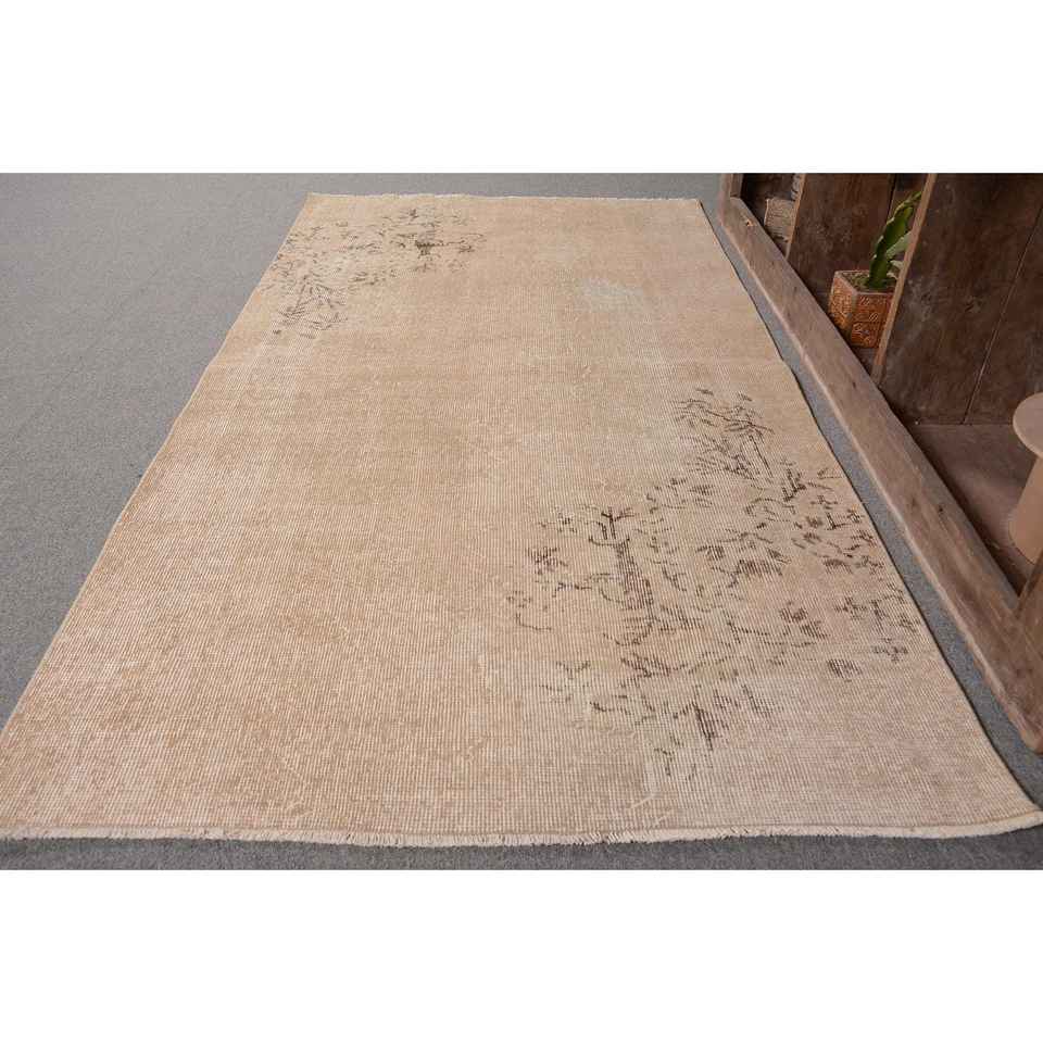 Vintage Turkish Rug Beige 3.6 X 6.6ft Handmade Wool Large Area Rectangle Patchwork Design for Hallway Latex Backing Room Rug