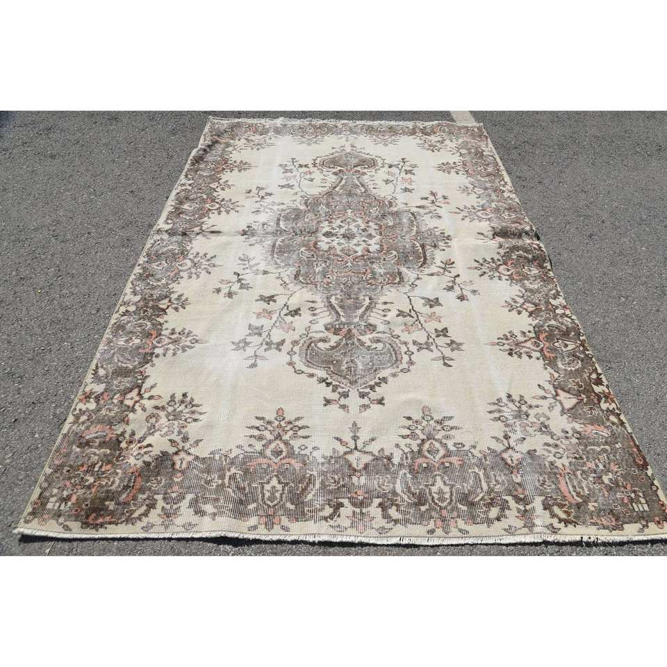 Vintage Turkish Rug Beige-Brown 6.1 X 8.9 ft Wool Flat Weave with Patchwork Pattern for Living Room Decorations Hallway Use