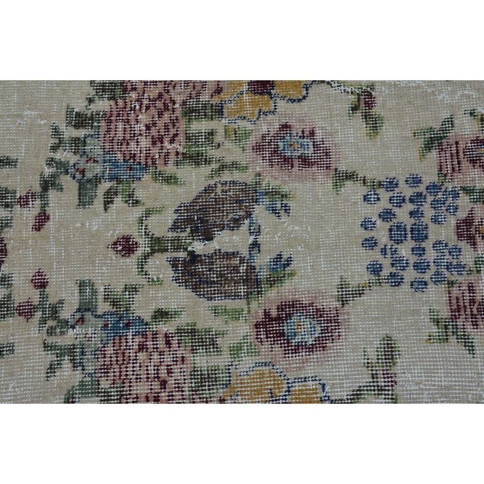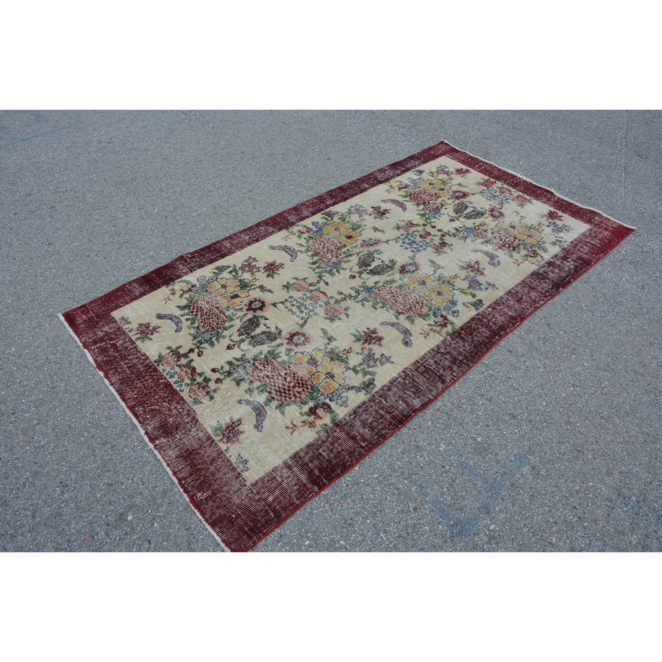 Vintage Turkish Rug Beige Red Wool with Classic Rectangle Patchwork Pattern Large Area 3.6 X 6.9ft Backed Latex for Hallway Use