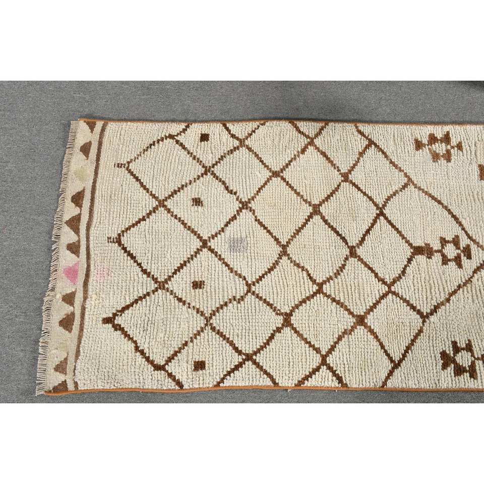 Vintage Turkish Rug Bohemian Beige Brown 2.6 X 10.4ft Large Area Patchwork Flat Weave Wool Latex for Hallway Rectangle Space