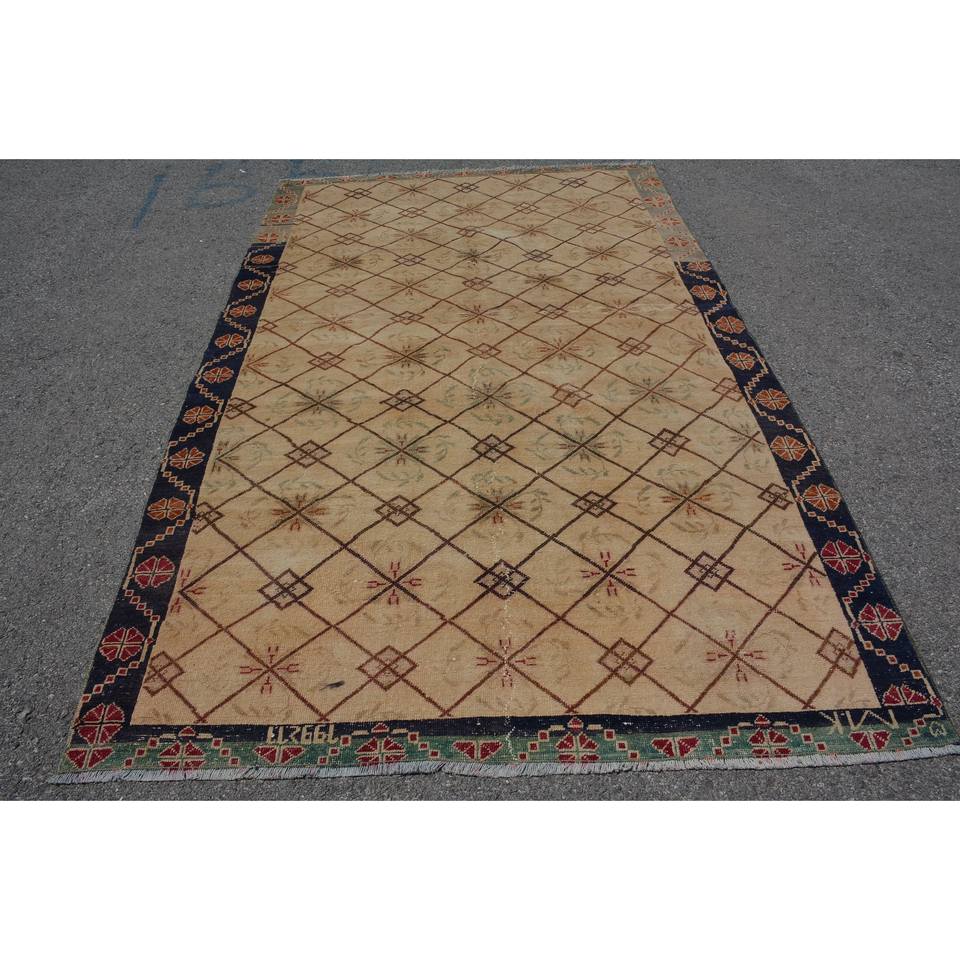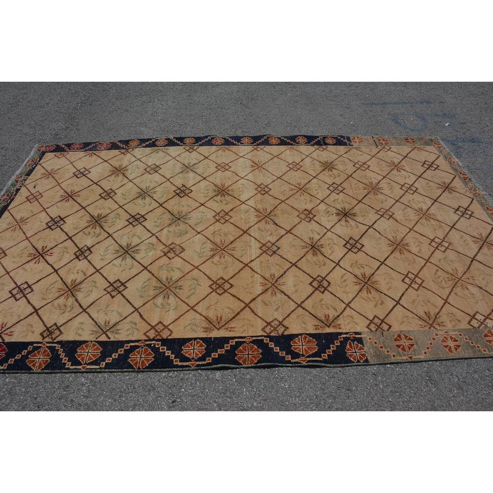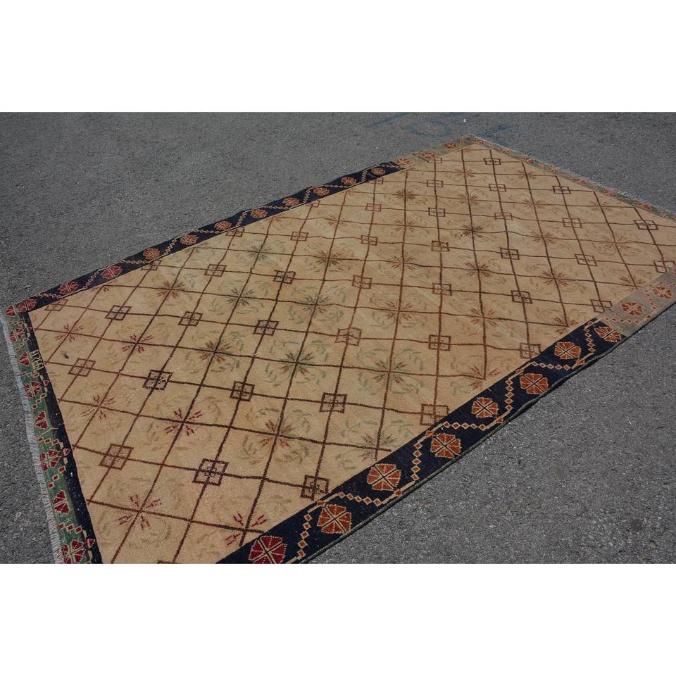Vintage Turkish Rug Classic Beige Black 5.6x9.1ft Handmade Patchwork Wool Latex Backing Rectangle Style Tabriz for Living Room