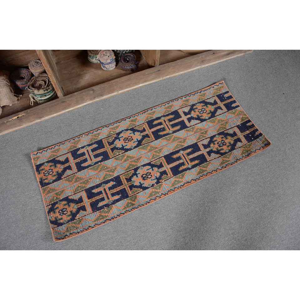 Vintage Turkish Rug Classic Blue Orange 1.6x3.8ft Handmade Wool Puzzle Patchwork Design for Entryway Rectangular Hallway Latex