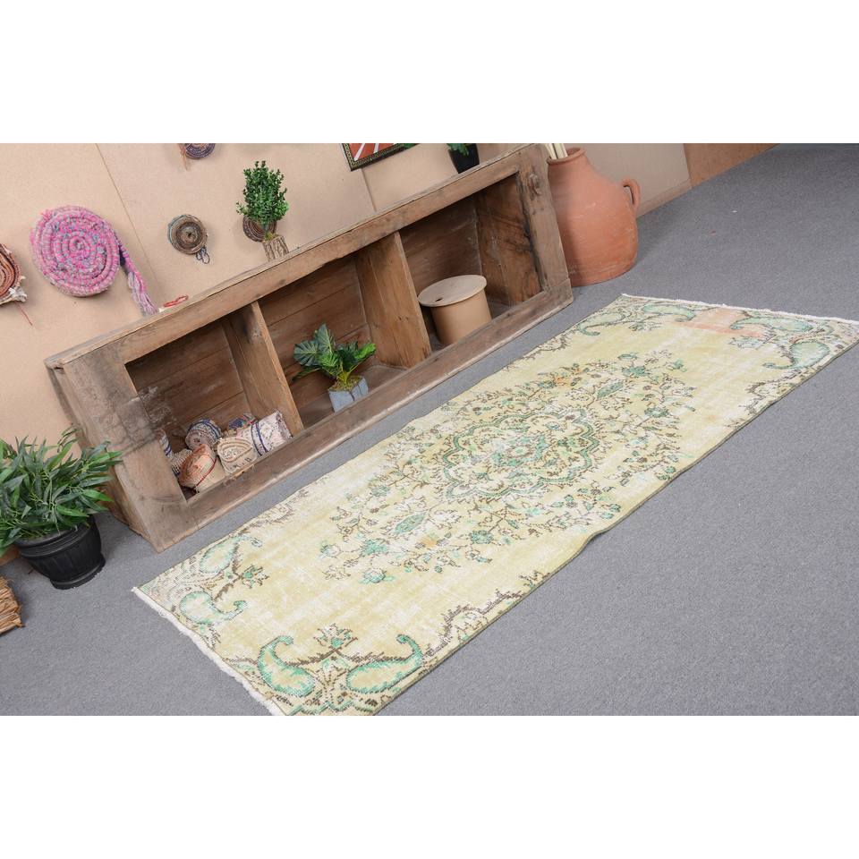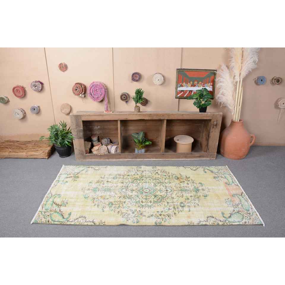 Vintage Turkish Rug Large Area 3.2 X 6.7ft Yellow Green Wool Abstract Patchwork Design for Hallway Rectangular Latex Room Rug