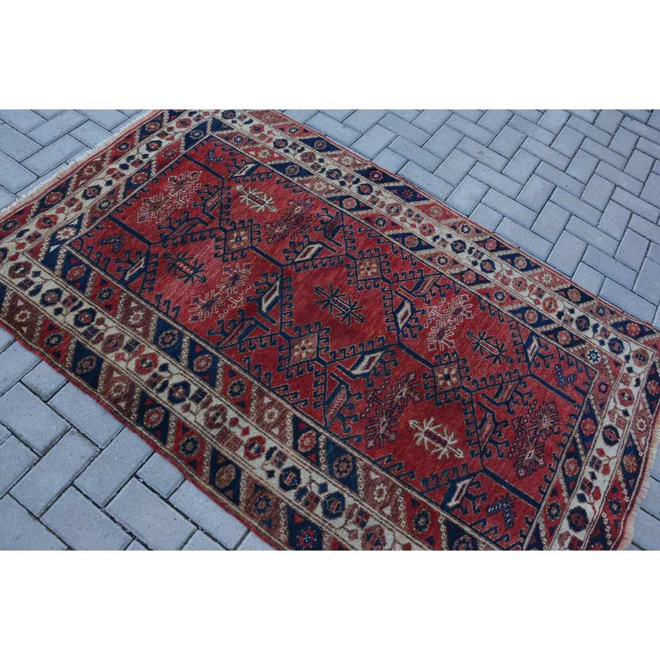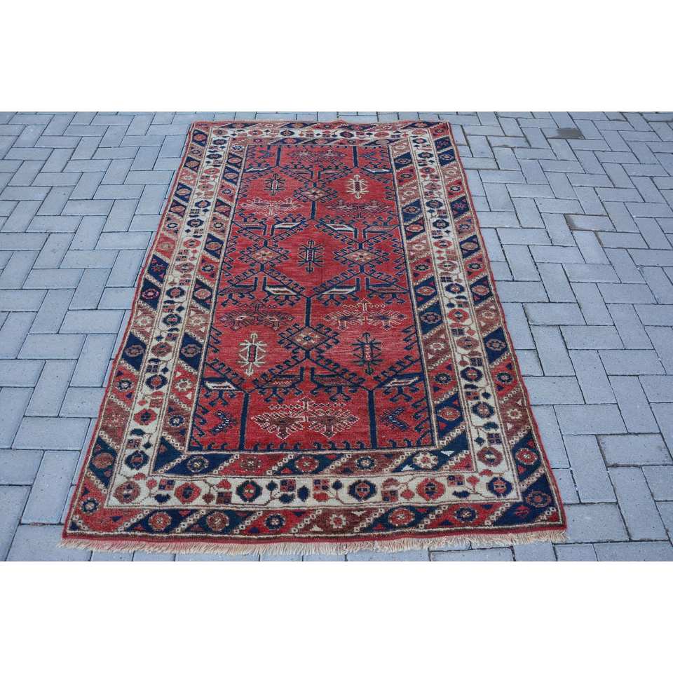 Vintage Turkish Rug Large Area 4.1 X 6.5ft Classic Red Black Abstract Pattern Wool Material 10mm Latex for Hallway Room