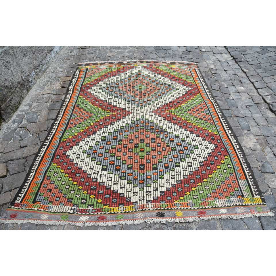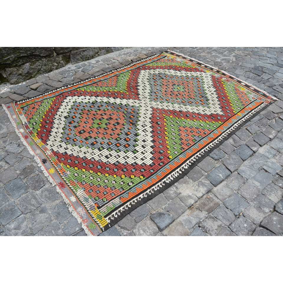 Vintage Turkish Rug Large Area 5.8 X 7.5 ft Indoor Red Green Wool Latex Patchwork Rectangular Shape Tabriz for Bedroom Hallway