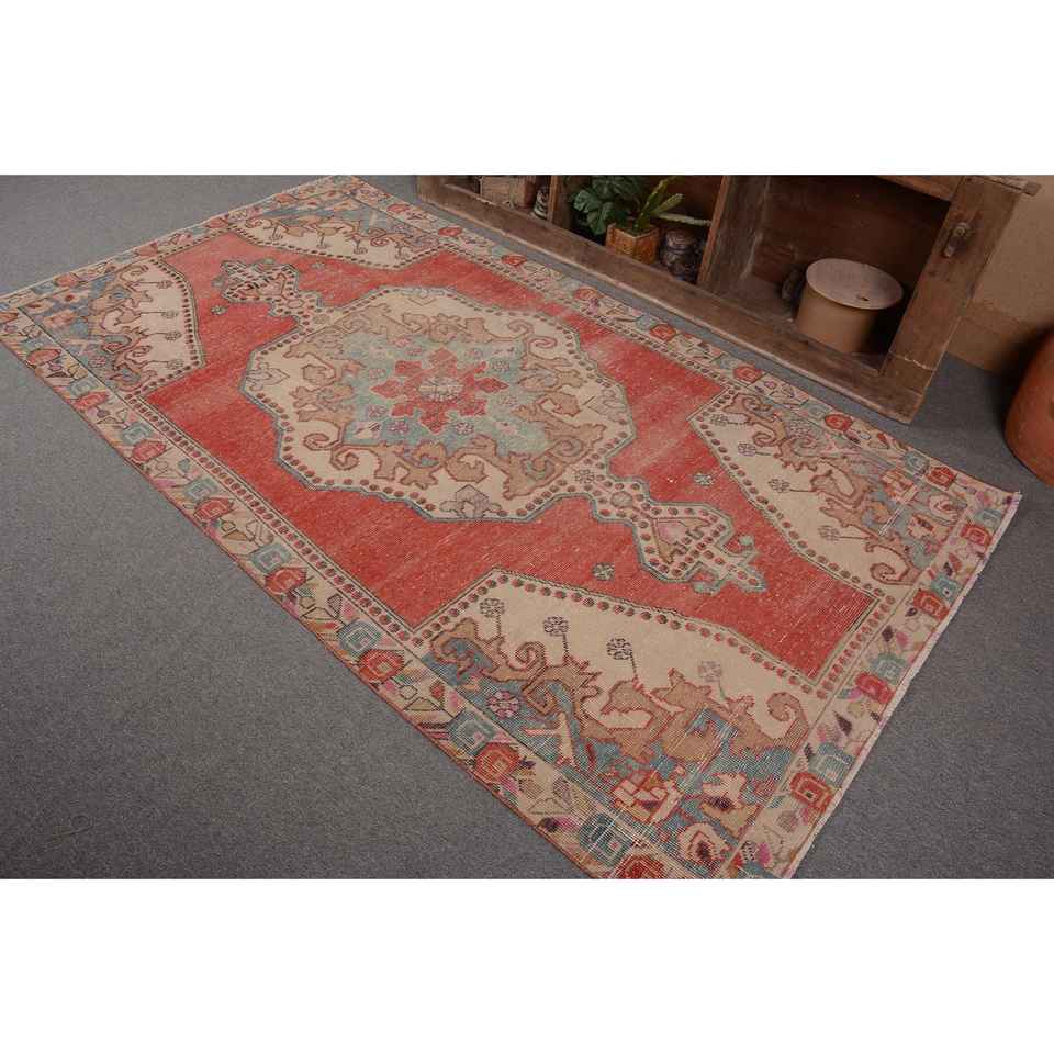 Vintage Turkish Rug Red Beige 4.5 X 8.2ft Large Area Woolen Patchwork Design for Hallway or Bedroom Latex Backed