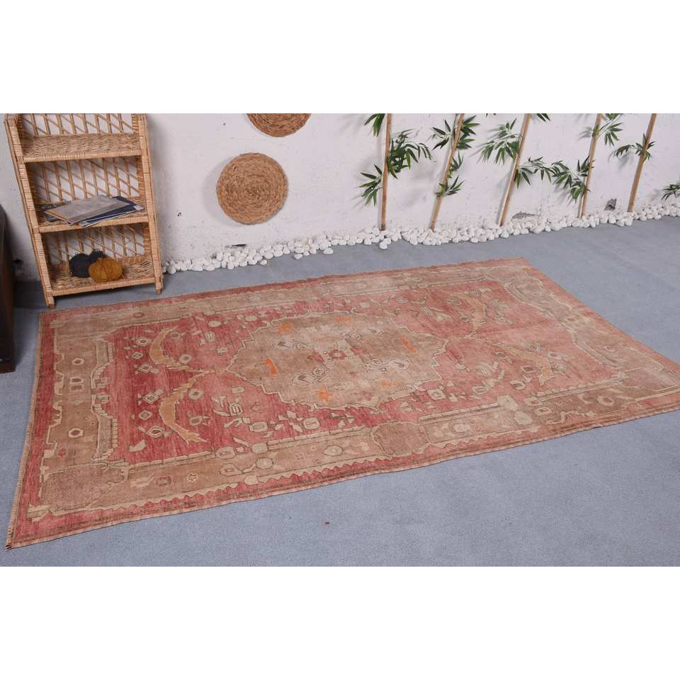 Vintage Turkish Rug Red Beige 4.6x7.8ft Large Area Woolen Patchwork Design for Hallway or Bedroom Latex Backed