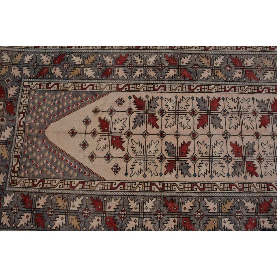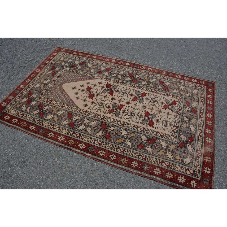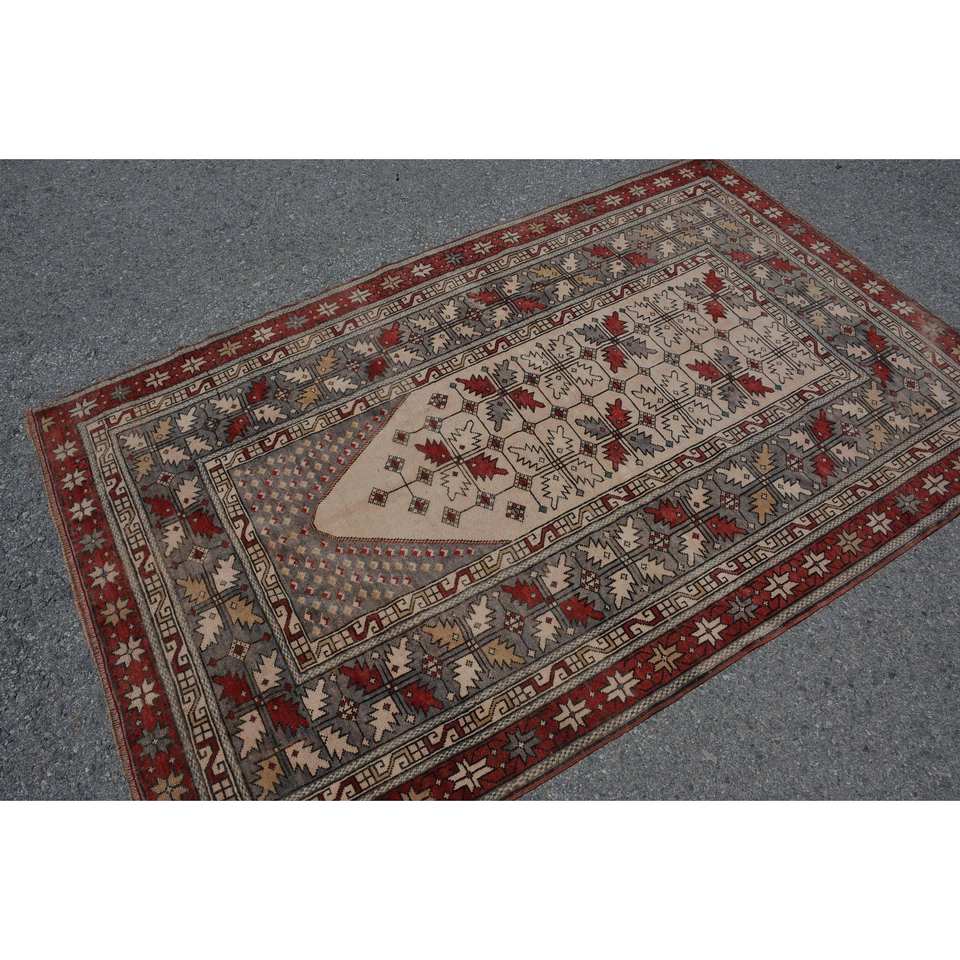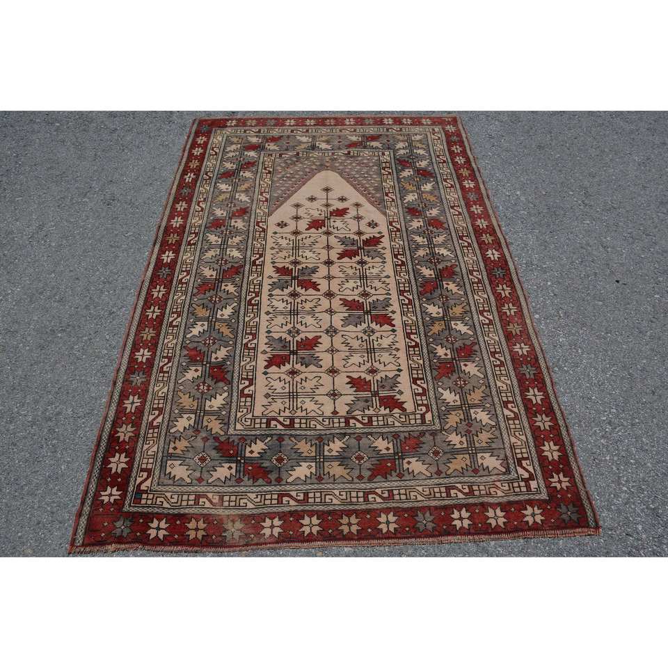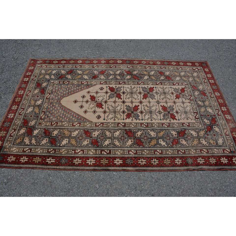 Vintage Turkish Wool Area Rug Red & Beige 4'1 X 6'4 ft Large Rectangle Abstract Patchwork Pattern 10mm Thickness Latex Backed"