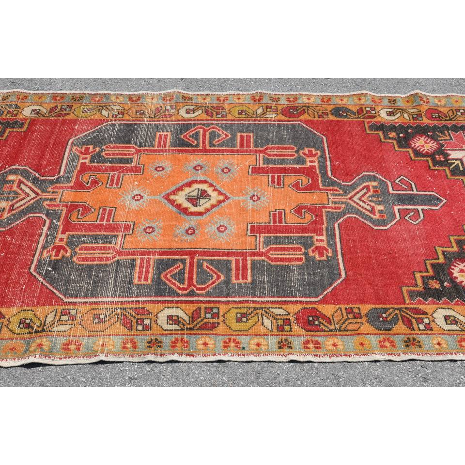 Vintage Turkish Wool Large Area Rug 4.4 X 9.4ft Red Orange Patchwork Design Latex Backing 10mm Thickness for Hallway Room Decor