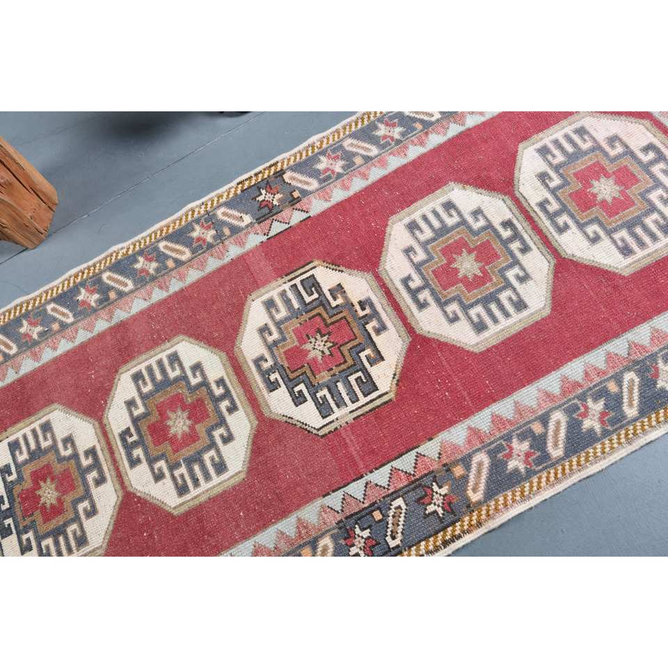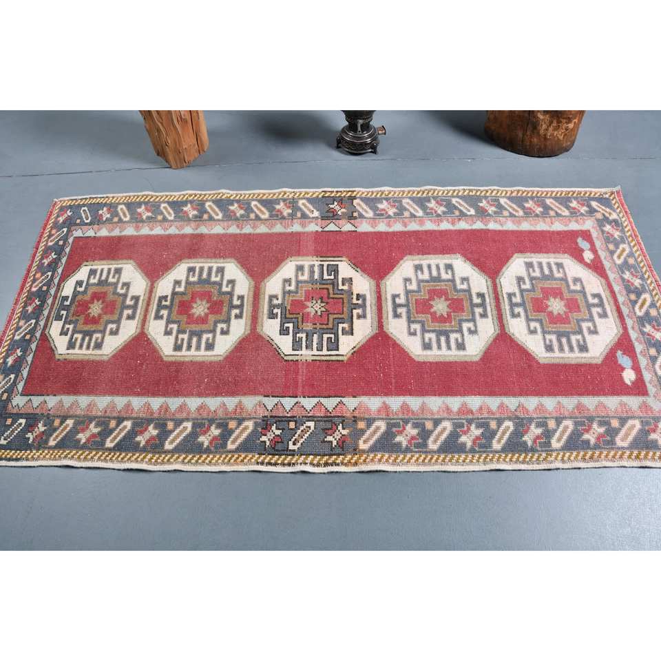 Vintage Turkish Wool Rug Red Beige 33 X 68 ft Large Rectangle Patchwork Design for Hallway Latex Traditional Style Room Rug