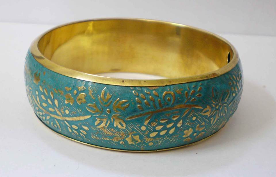 Vintage Turquoise Verdigris Copper Bangle With Elegant Gold Floral Vine Etching Luxury Antique Style Brass Bracelet Metal Craft