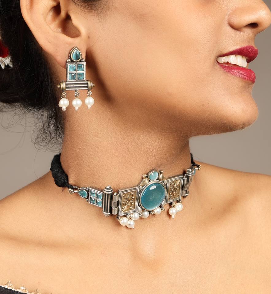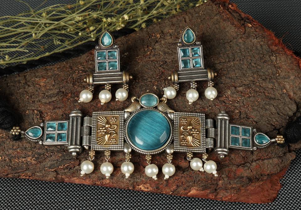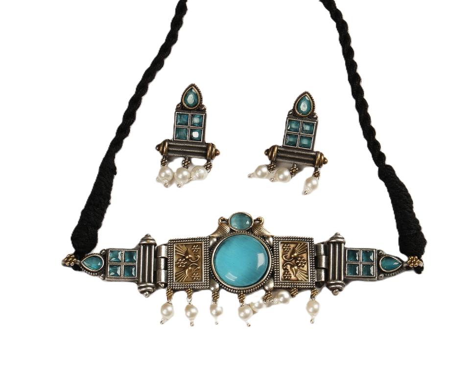 Vintage Two Tone Oxidized Silver Gold Plated Bohemian Monalisa Stone Choker Necklace Set Turquoise Pearl Drop Engagement