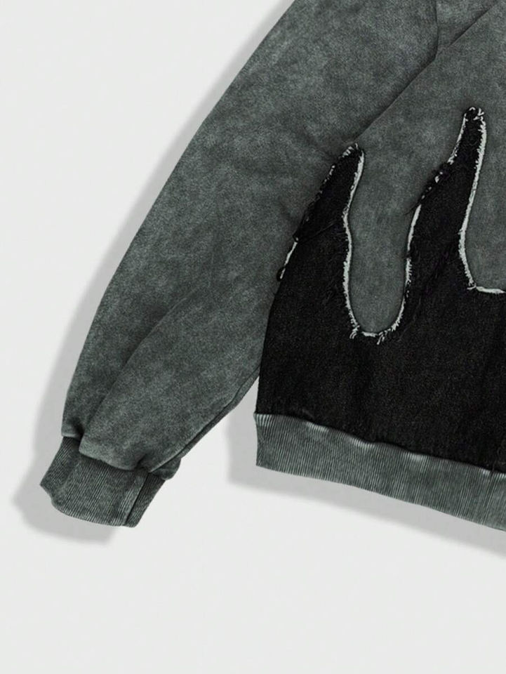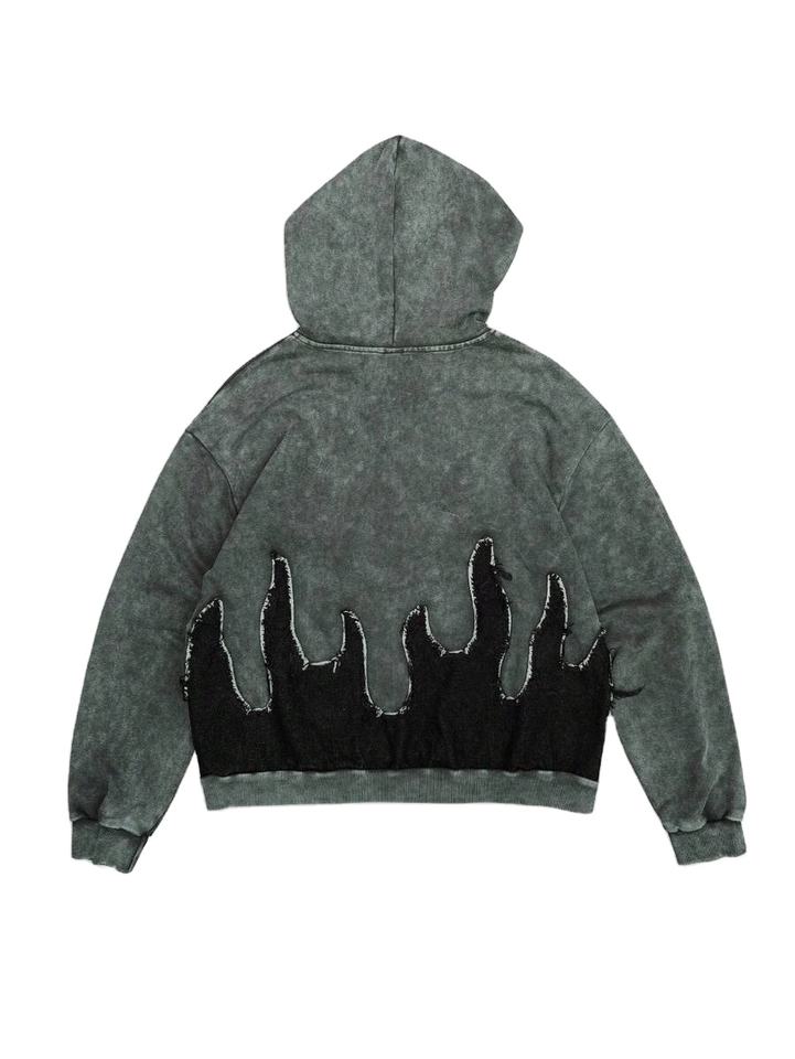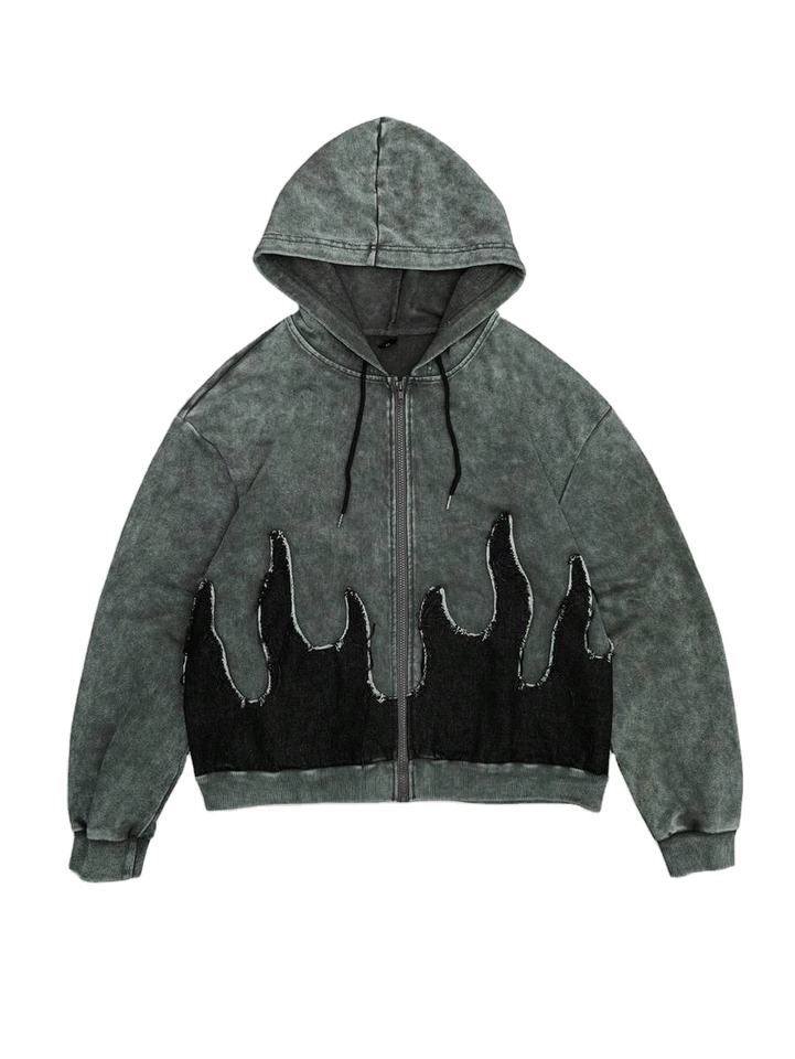 Vintage Washed Zip Up Hoodie with Black Flame Stitch Detail Cotton French Terry Blank Distressed Hoodie for Men Jacket Featuring
