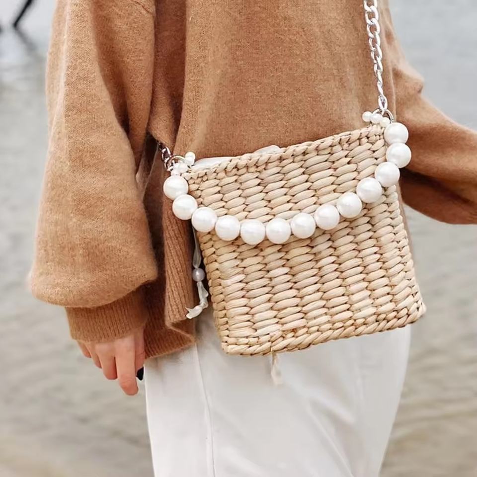 Vintage Water Hyacinth Handbags, Multi-purpose Water Hyacinth Tote Bags with Pearl Beads in Vietnam Wholesale