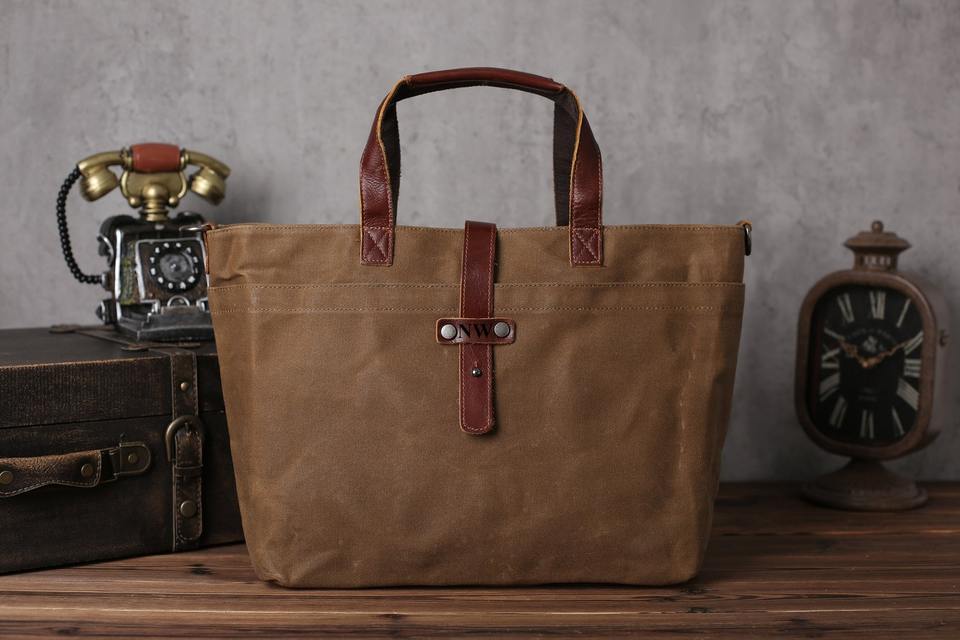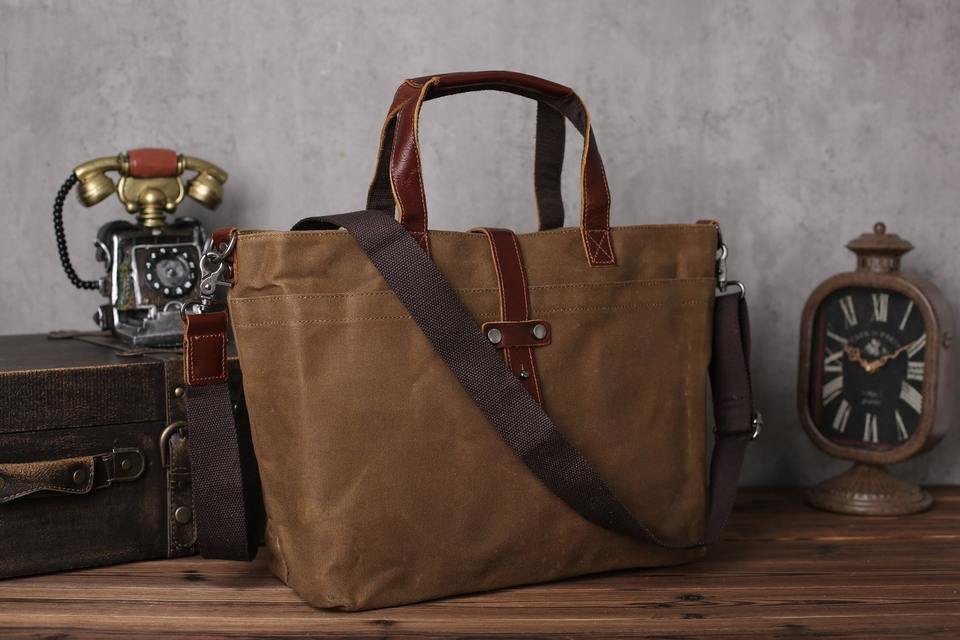 Vintage Waxed Canvas Tote Bag with Leather Straps Handmade Durable Large Capacity Bag for School Travel LCT-0008