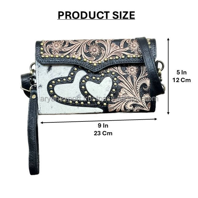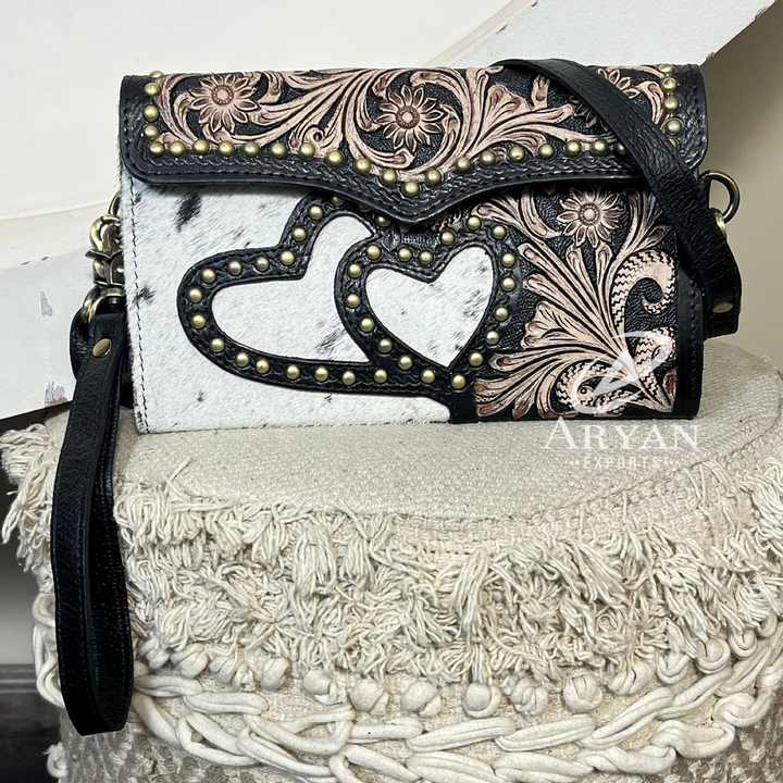 Vintage Western Style Hair On Hide Tooled Leather Shoulder Crossbody Mini Bags New Heart Design Artwork Clutches For Women's