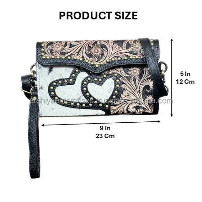 Vintage Western Style Hair On Hide Tooled Leather Shoulder Crossbody Mini Bags New Heart Design Artwork Clutches For Women's