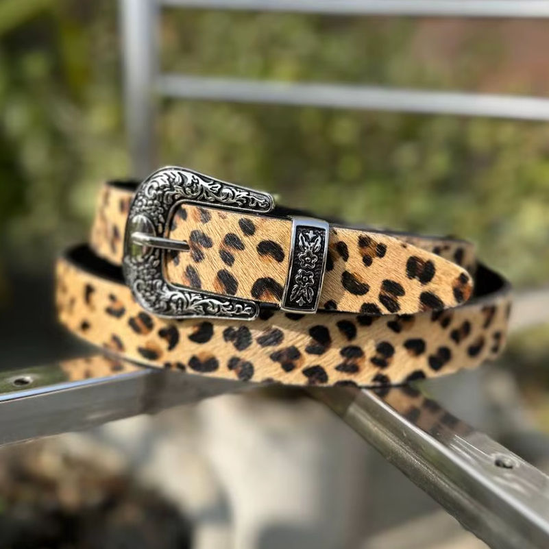 Vintage Western Style Leopard Hair on Leather Belt with Heavy Duty Alloy Pin Buckle Durable Comfortable Wear