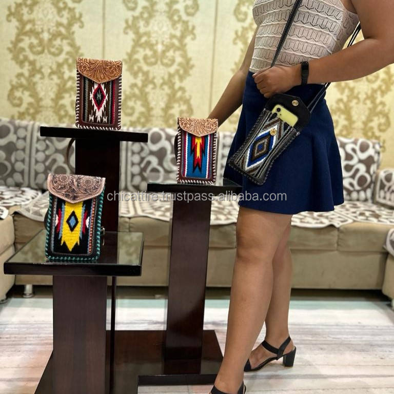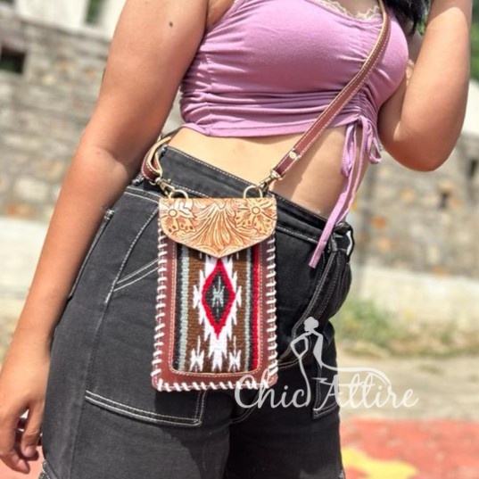 Vintage Western Tooled Genuine Leather Phone Crossbody Sling Bag With Aztec Jacquard Fabric Personalized Cowgirl Mini Handbags