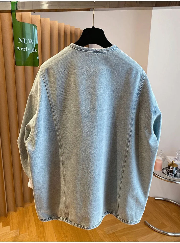 Vintage Women Blue V Neck Loose Denim Jacket