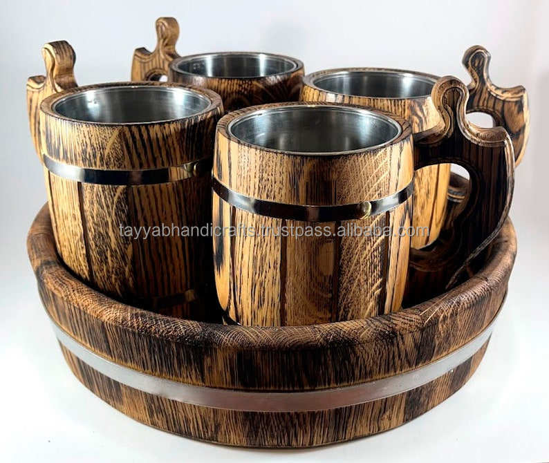 Vintage Wooden Beer Mug Real Oak Wood Stainless Steel Cup for Halloween Christmas and New Year gift