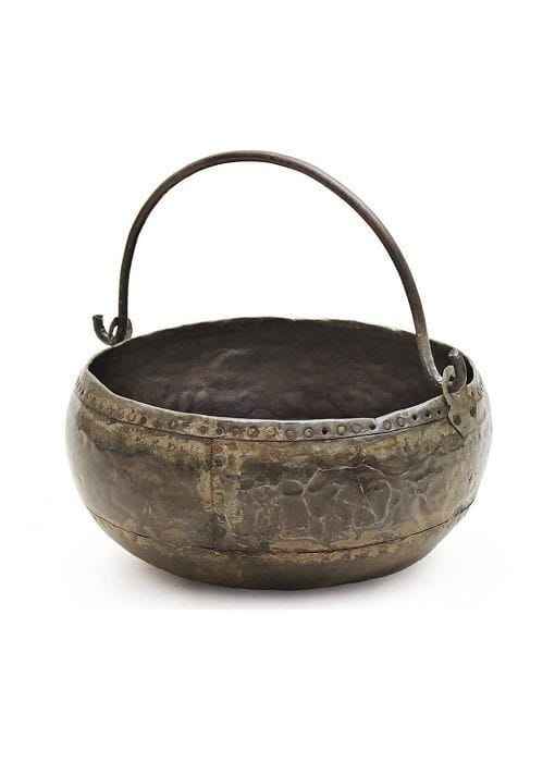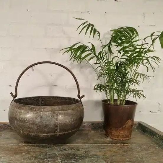 Antique Style Vintage Metal Big Pot Design Wooden Bowl Iron Handle Home Decorative Accessory for Restaurant Hotel Art-Inspired