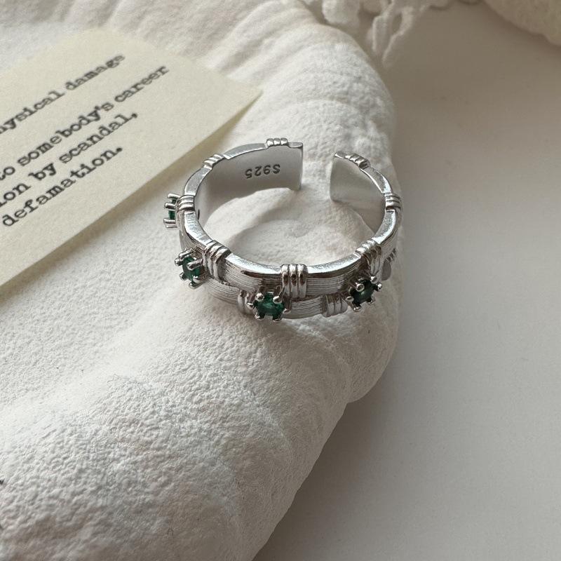 Vintage Woven Ring with Green Zircon S925 Pure Silver Elegant Temperament European American French Niche Design Inlaid Set