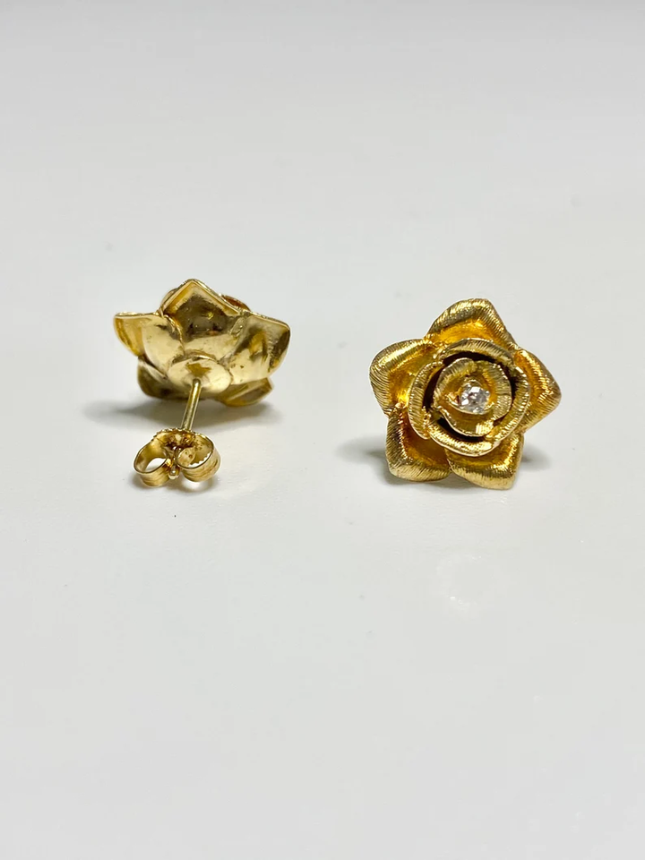 Vintage Yellow Gold Plated 14k Solid Gold Flower and Diamond Stud Earrings Women's Fashion Alloy Jewelry for Weddings