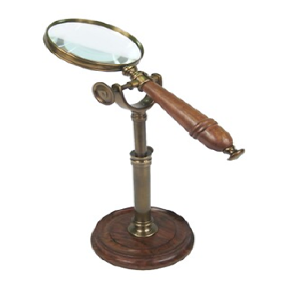 Vintage brass magnifying glass with wooden accents, mounted on a tall, slender brass stand with a round wooden base at wholesale