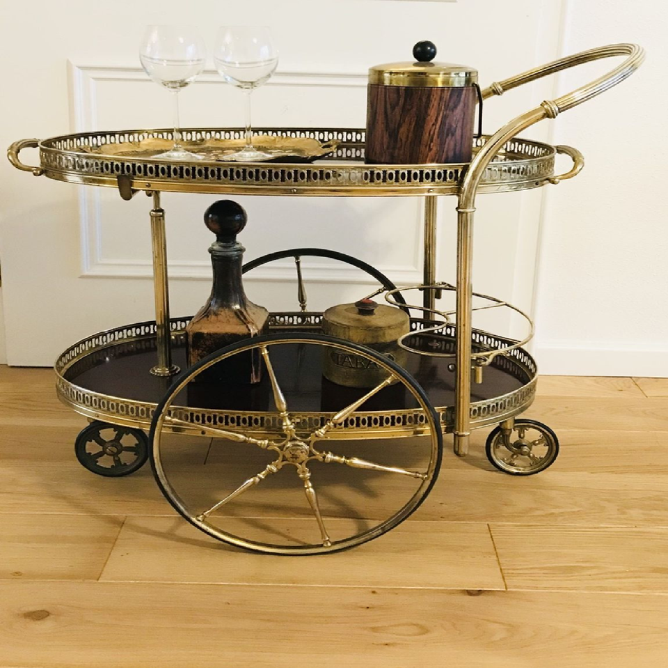 Vintage gold bar cart with elegant curved metal frame and large spoked wheels. Available at wholesale price.
