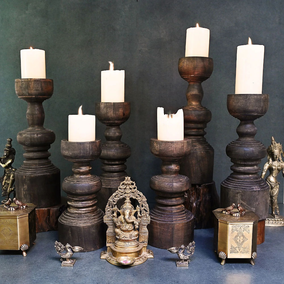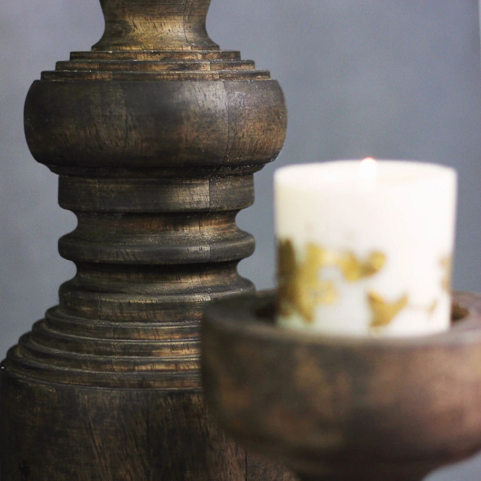 Vintage Rustic Wooden Pillar Candle Holder Figurine Set Handcrafted Eco-Friendly Customizable Antique Dark Brown Candle Stand