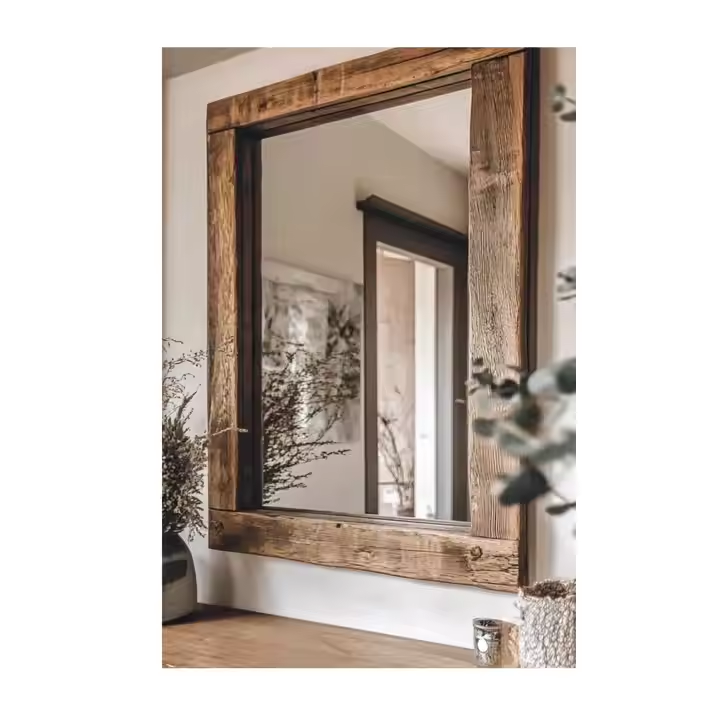 Vintage wooden mirror frame with detailed handcrafted work for rustic wall decor in entryway bedroom by Azora Industries