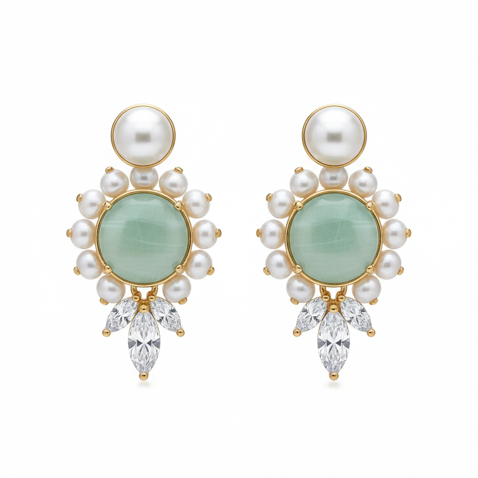 Vintagelike Round Faceted Opalite & Small Round Pearl Stud Earrings Beautiful Statement for Women for Weddings Mainly Made Brass