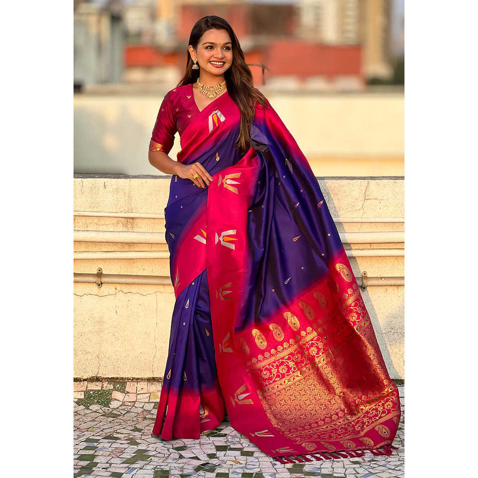 Violet South Traditional Tilak Contrast Soft Silk Zari Woven Saree Indian & Pakistani Clothing