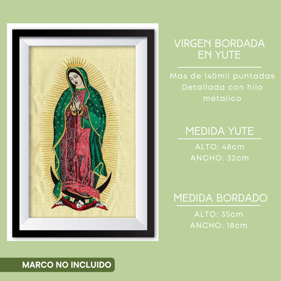 Virgin of Guadalupe Embroidered in Jute with Metallic Thread Details 48 X 32 cm More Than 140 Thousand Stitches