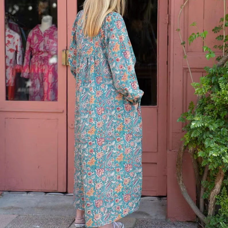 Virginia Handblock Printed Dress Pure Cotton Bohemian Midi Ethical Handmade Floral Block Print Casual Summer Outfit
