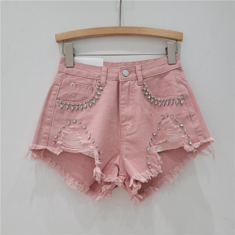 Viviblook C316PT 2024 Summer Ripped Shorts Denim Patchwork High Waist Shorts for Women Diamond Jean Shorts With Pockets