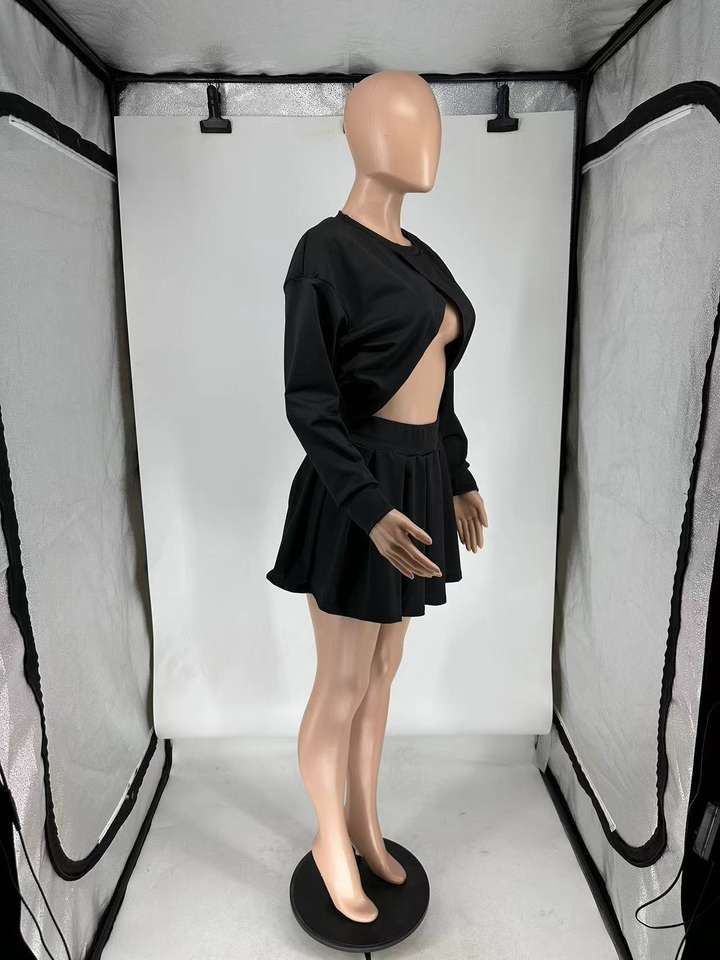 Viviblook C510ST Reversible Outfits Women's Sets Casual Solid Streetwear Cut Out Top With Pleated Skirt 2 Piece Tweed Set Women