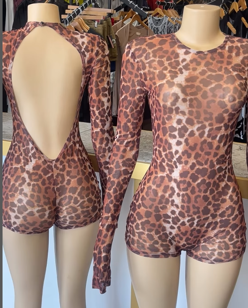 Viviblook D24RP687 Women Outfit Round Neck Leopard Pattern Mesh Button Hollow Out Backless Romper Bodycon