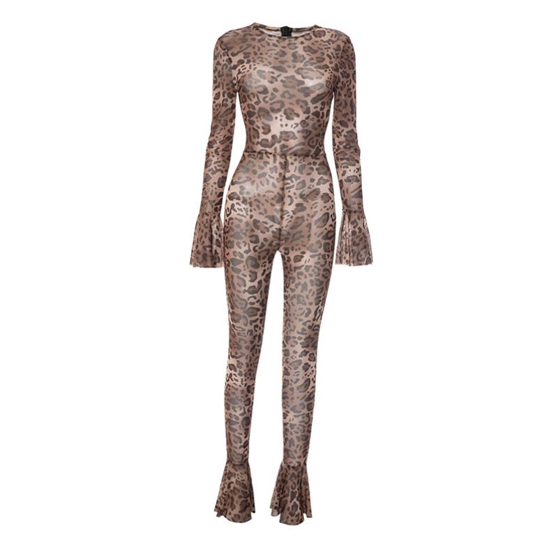 Viviblook J25JP097 Summer Women's Bodycon Summer See Through Leopard Print Mesh Printed Flared Sleeve One Piece Jumpsuit