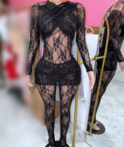 Viviblook R23ST188 New Arrival Women's Casual Set Lace See Through Long Sleeves Jumpsuit Skirt Two Piece Set