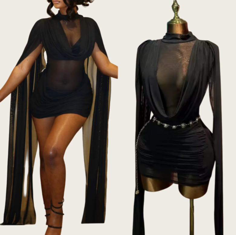 Viviblook Z0122DS02 New Women Dresses High Collar Double layer Splicing Mesh See Through Ribbon Party Dress