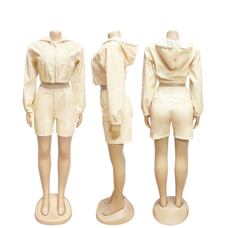 Viviblook Z1118ST01 Women's Leather Suit Casual Hooded Zipper Jacket Shorts Matching PU 2 Piece Plus Size Set