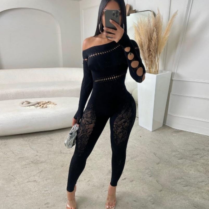 Viviblook Z1122JP Sexy Playsuit Women See Through Hollow Autumn Thin Long Sleeve Stretch Midnight Lingerie Romper Bodycon