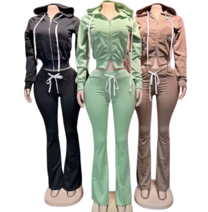 Viviblook Z1204ST Women's Tracksuit Hooded Zipper Cardigan Jacket Slim Fit Flared Two Piece Pants Plus Size Set For Women