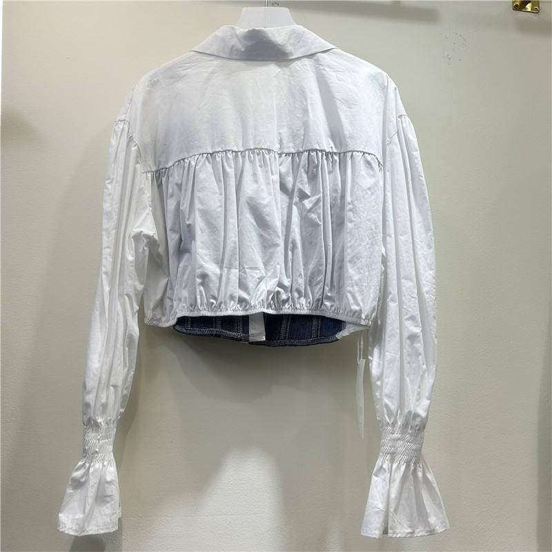 Viviblook Z1210TP03 New Women's Shirt Denim Patchwork Contrasting Color Flared Sleeve Blouse Crop Top for Ladies