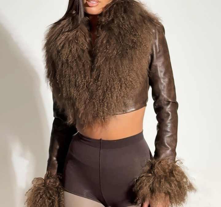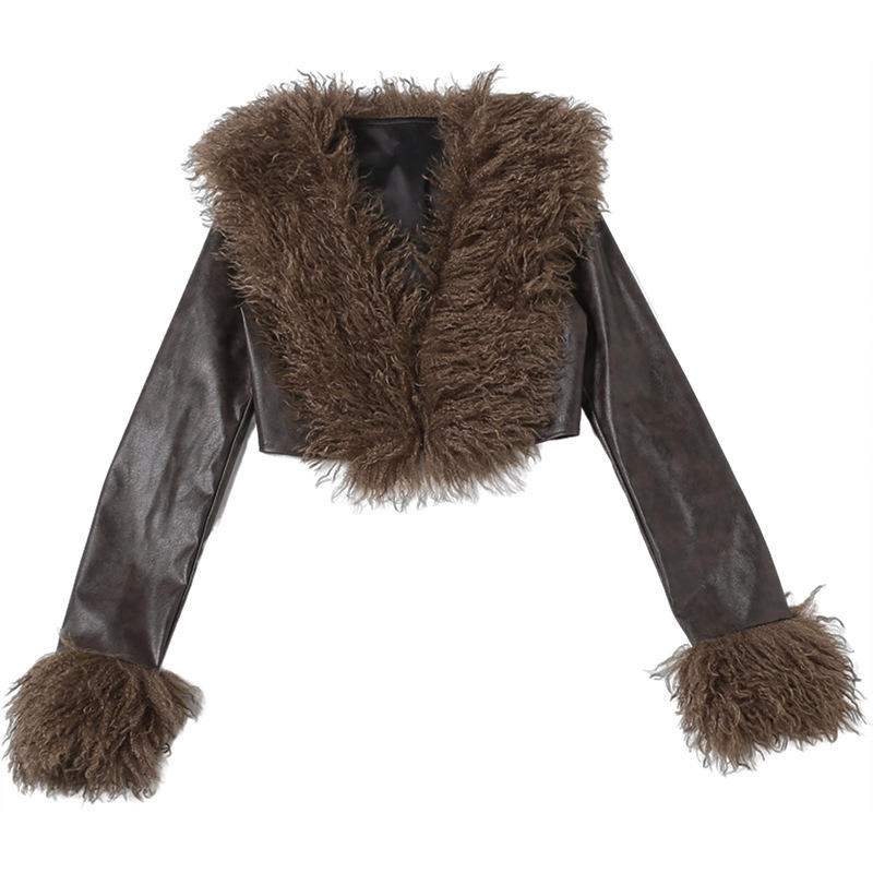 Viviblook Z1222TP New Women's Coat Fur Collar Tassel Patchwork Long Sleeved V-Neck Leather Jacket Crop Top